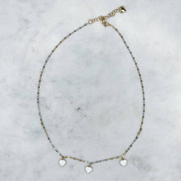 Ce collier délicat se distingue par son design fin et romantique. Sa chaîne bicolore en acier inoxydable, mêlant subtilement des nuances argentées et dorées, est ornée de trois petits cœurs blancs pour une touche douce et lumineuse.
