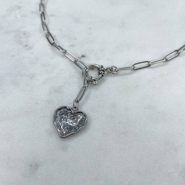 Ce collier au caractère affirmé se distingue par sa chaîne à larges maillons et son pendentif cœur à l’effet martelé, au rendu organique et lumineux.