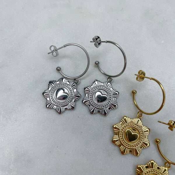Affirmez votre style avec ces boucles d'oreilles rayonnantes. Alliant la force d'un médaillon solaire et la douceur d'un cœur central.