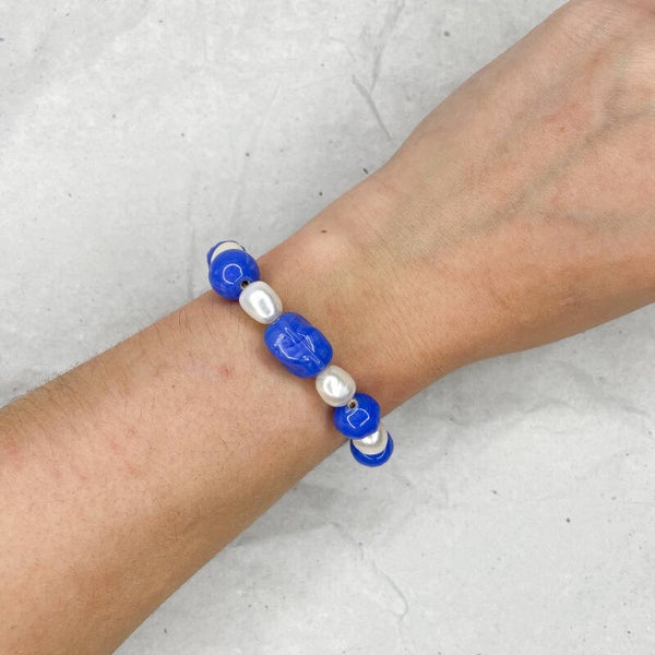 Un bracelet fait main au charme frais et délicat, mêlant perles bleues lumineuses et perles blanches nacrées pour un contraste doux et élégant.