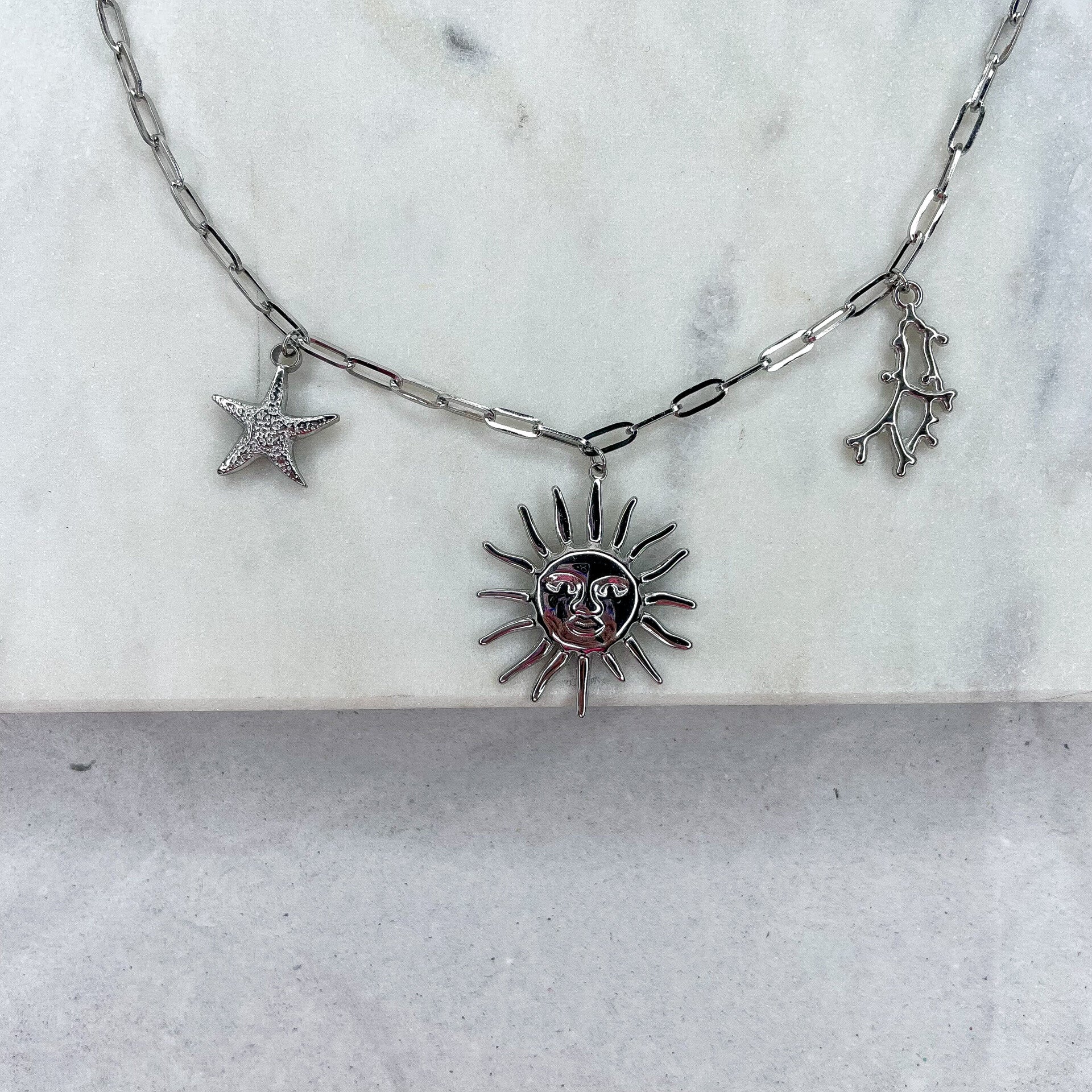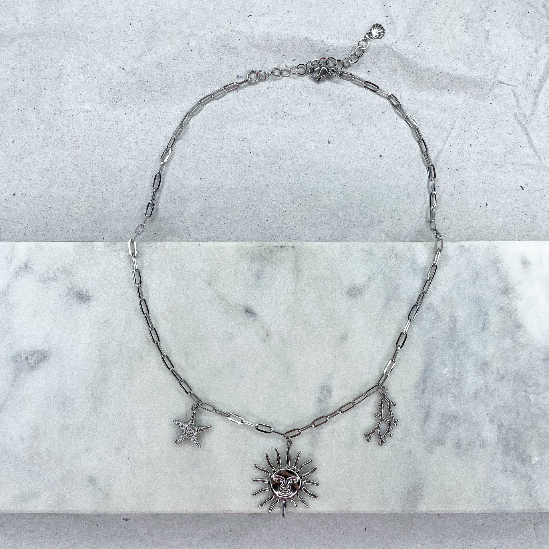 Ce collier à maillons larges est orné de trois pendentifs sur le thème de l'été et de la mer. Pour un look à la fois moderne et estival.