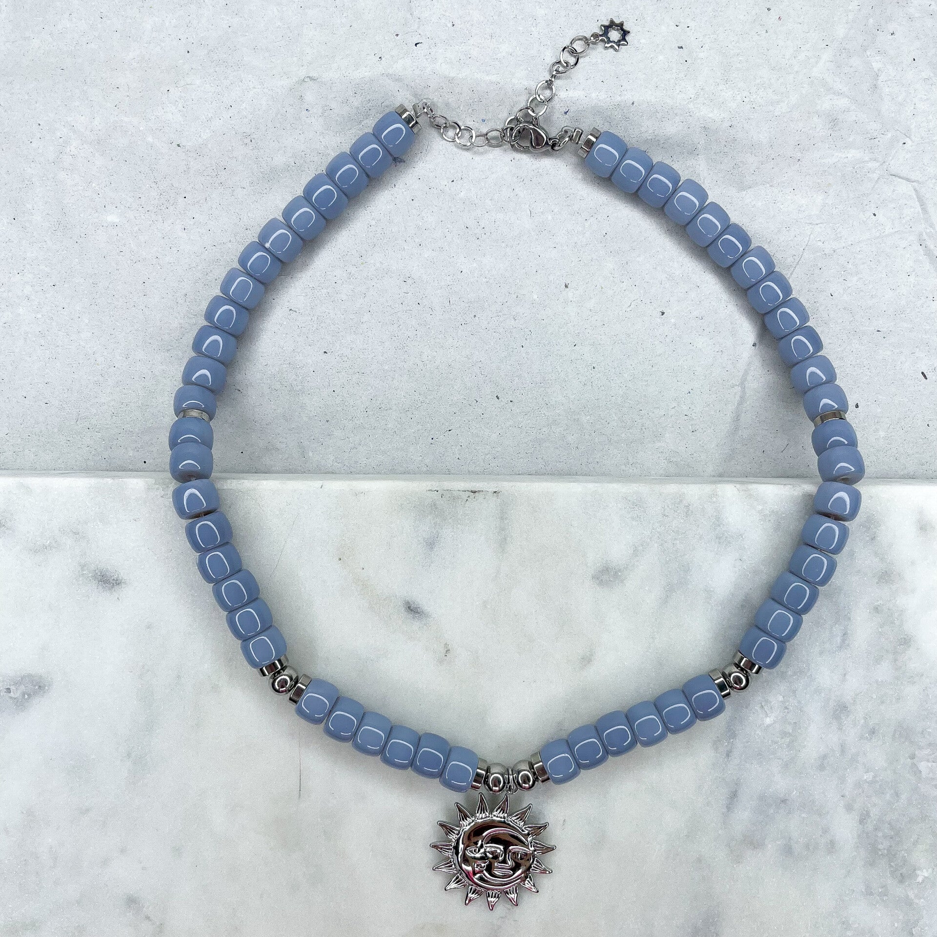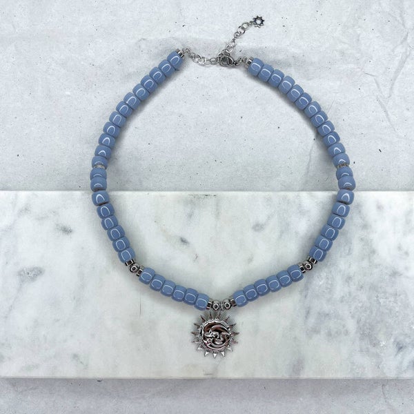 Laissez-vous envoûter par ce collier qui célèbre l'union sacrée des astres. Son pendentif central met en scène un visage où le Soleil et la Lune ne font qu'un, symbole d'équilibre et d'harmonie.