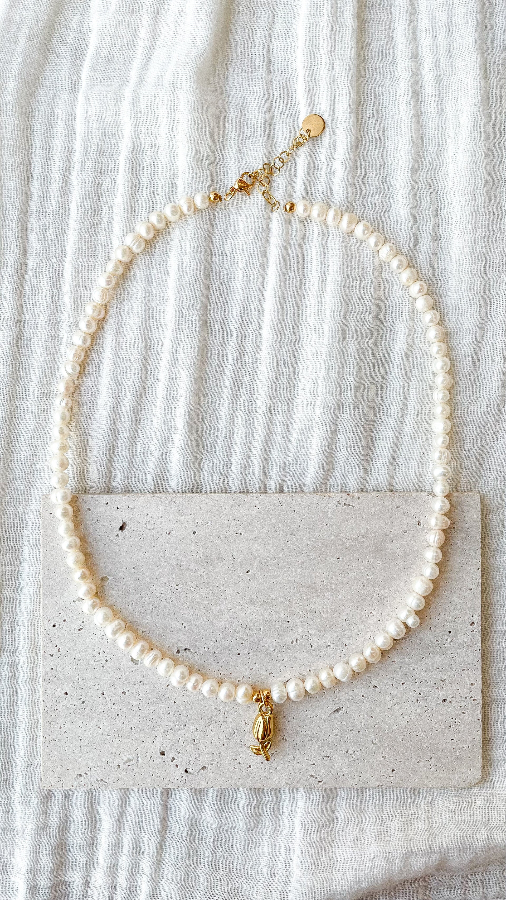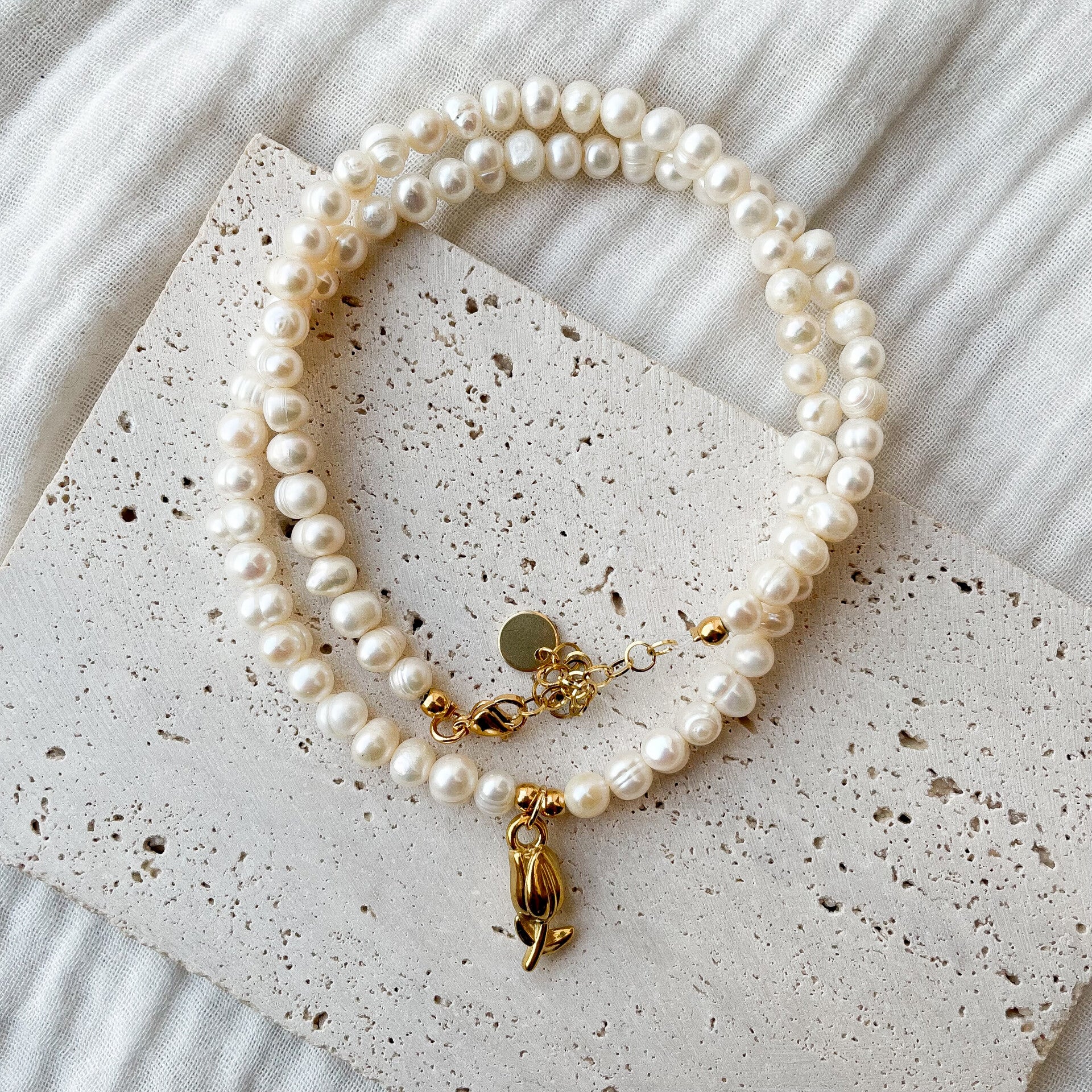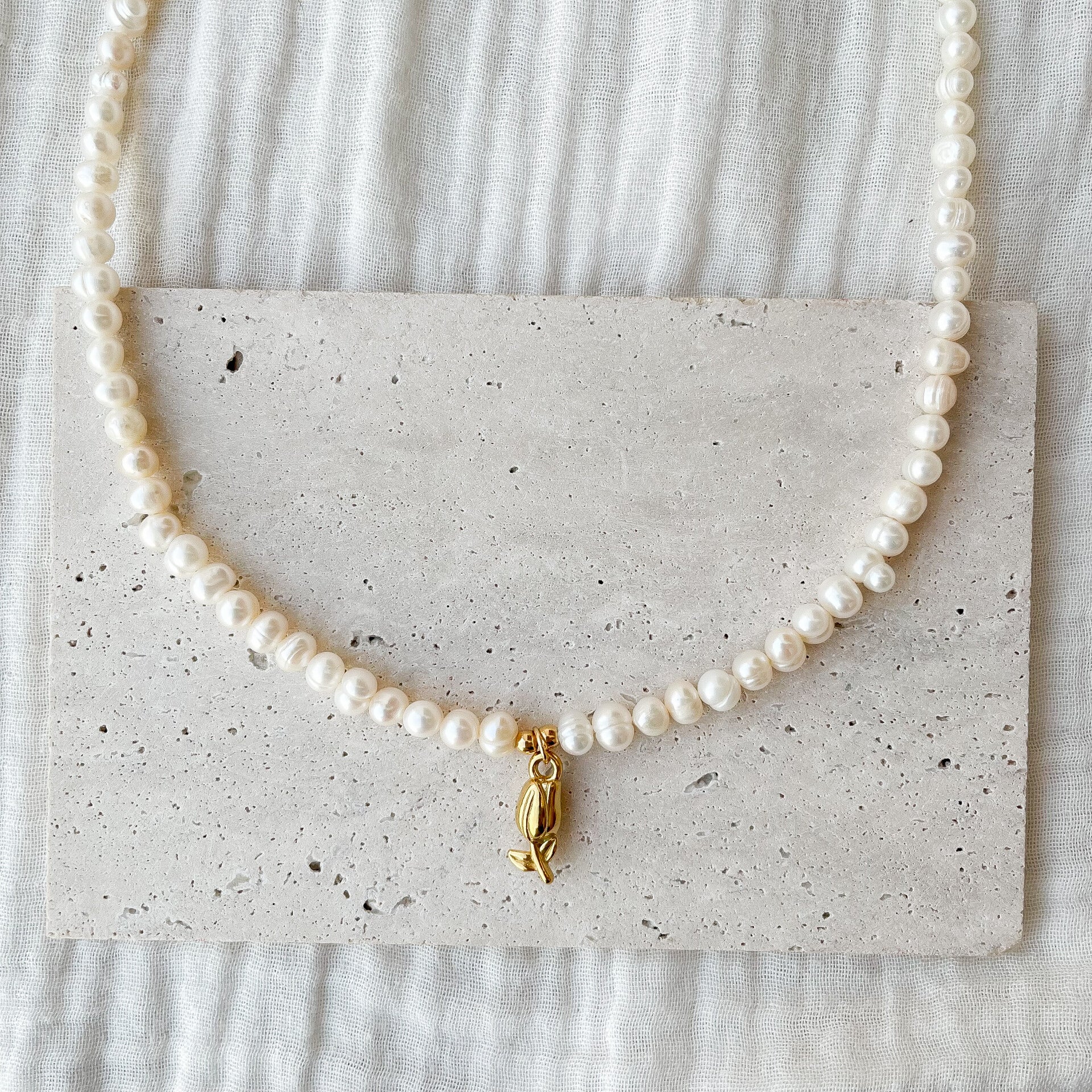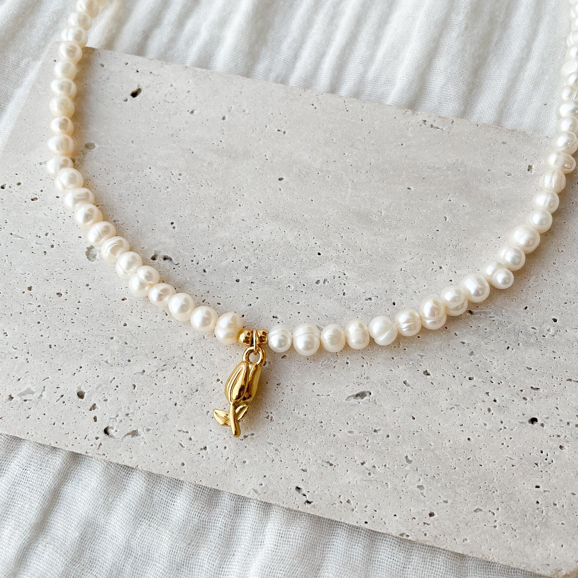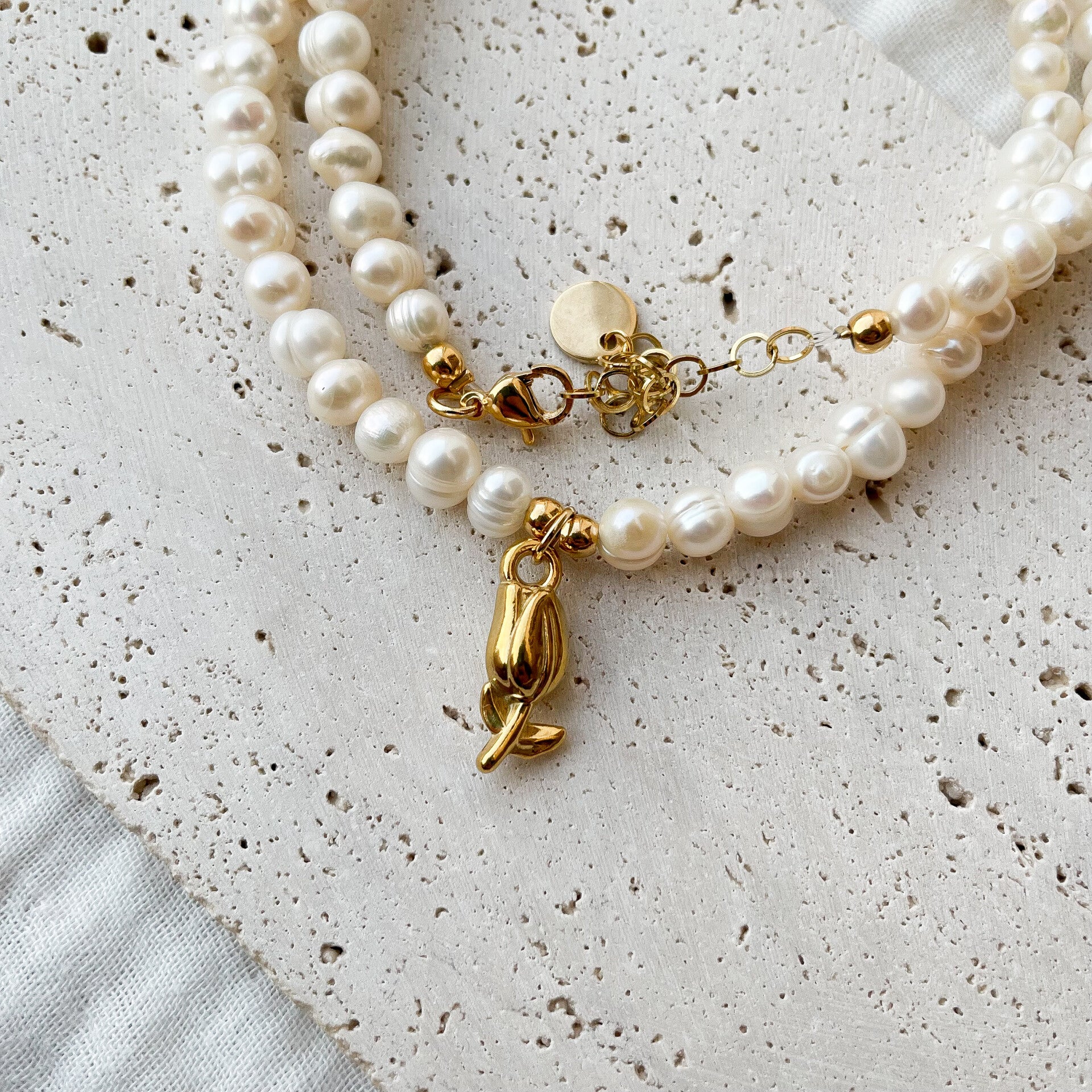 Un collier délicat et romantique, entièrement fait main, alliant la douceur naturelle des perles d’eau douce à l’élégance d’un pendentif tulipe doré.