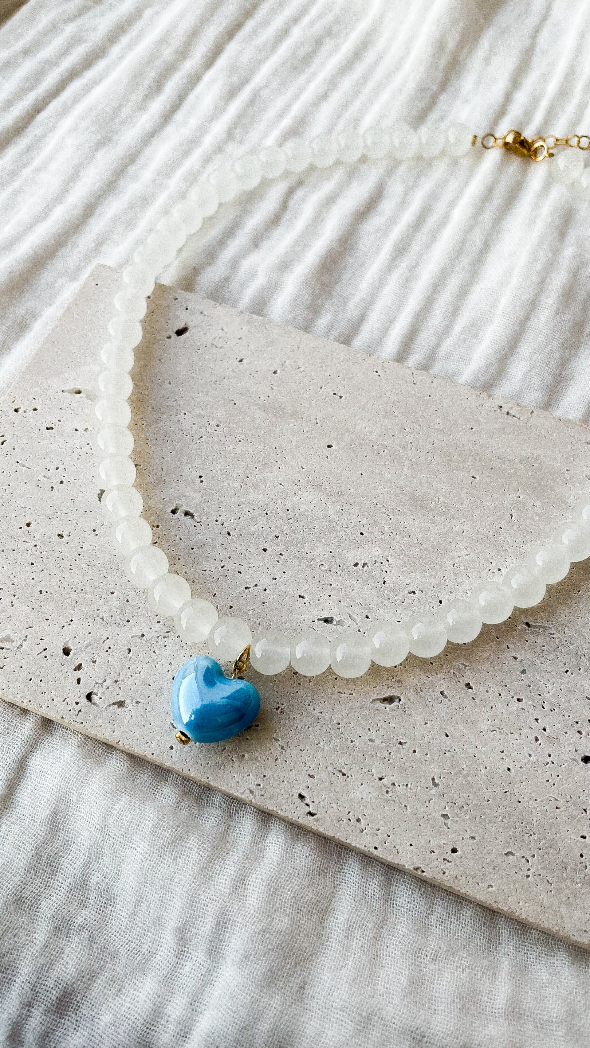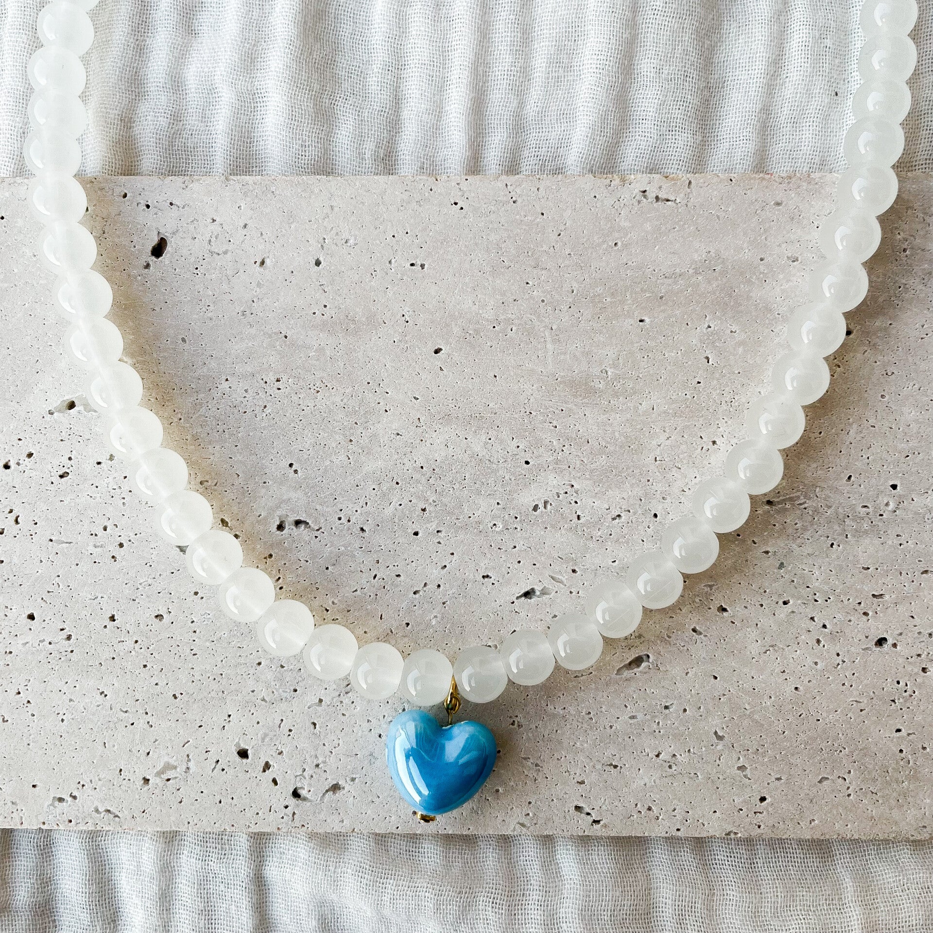 Un collier fait main tout en douceur et en couleur, qui associe la transparence laiteuse des perles blanches à la vivacité d’un cœur en céramique bleu azur.