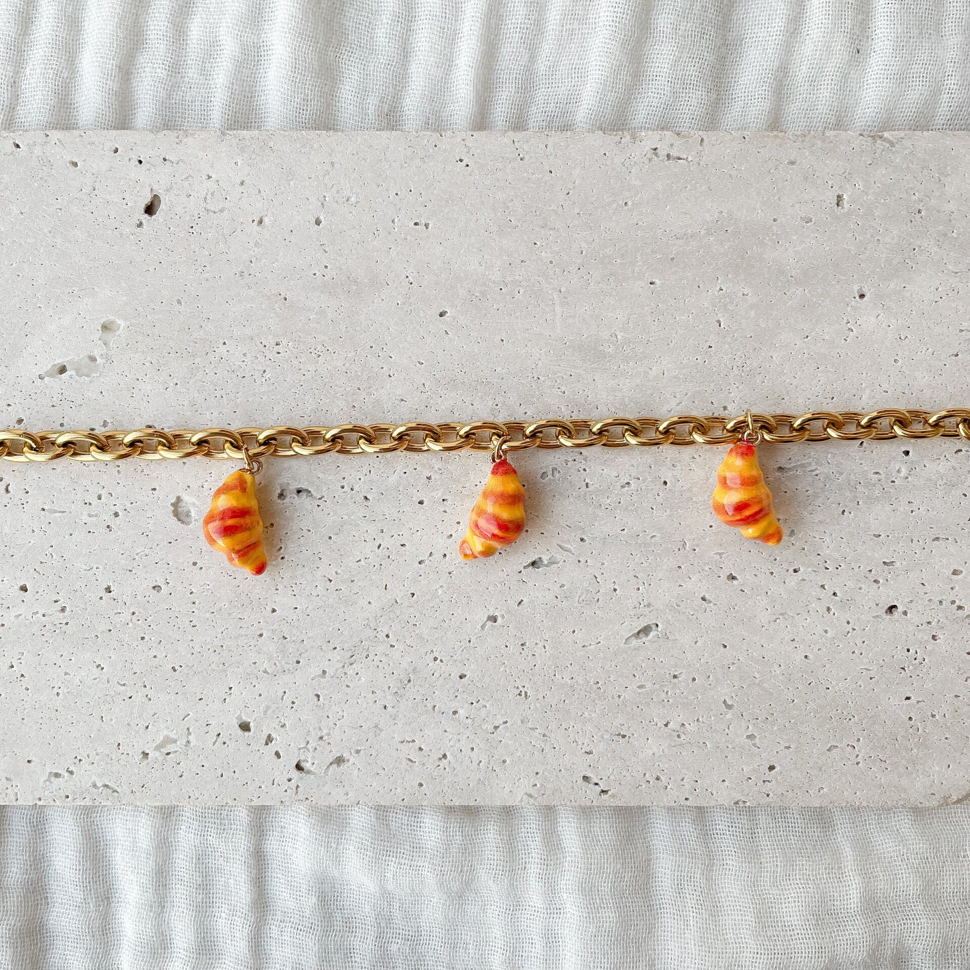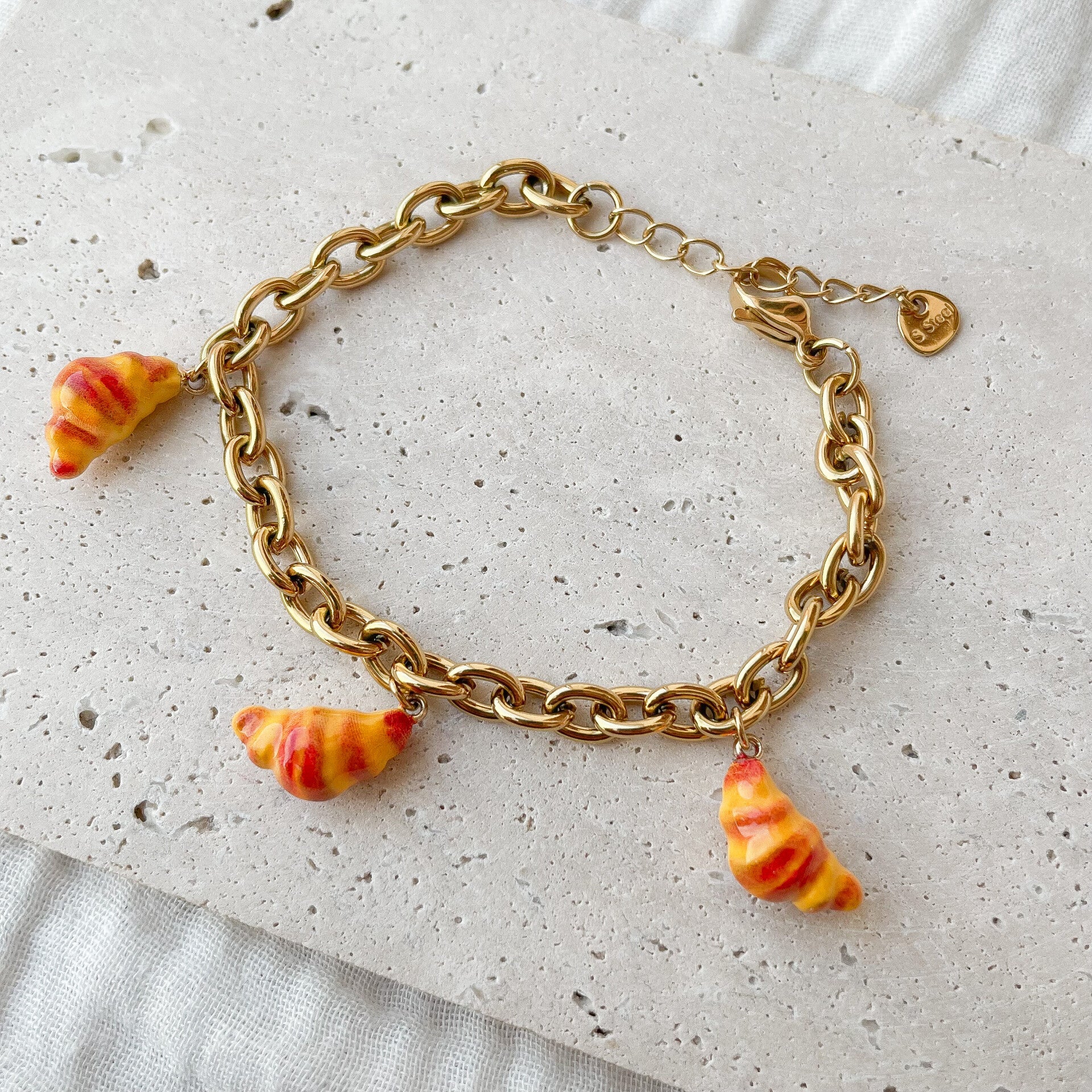 Bracelet fait main en acier inoxydable, composé d’une chaîne épaisse à grands maillons et de trois charms croissants. Une pièce gourmande, originale et pleine de caractère qui ne passera pas inaperçue !