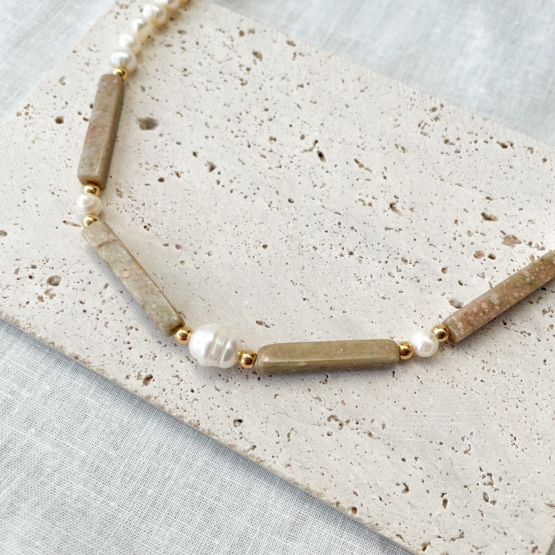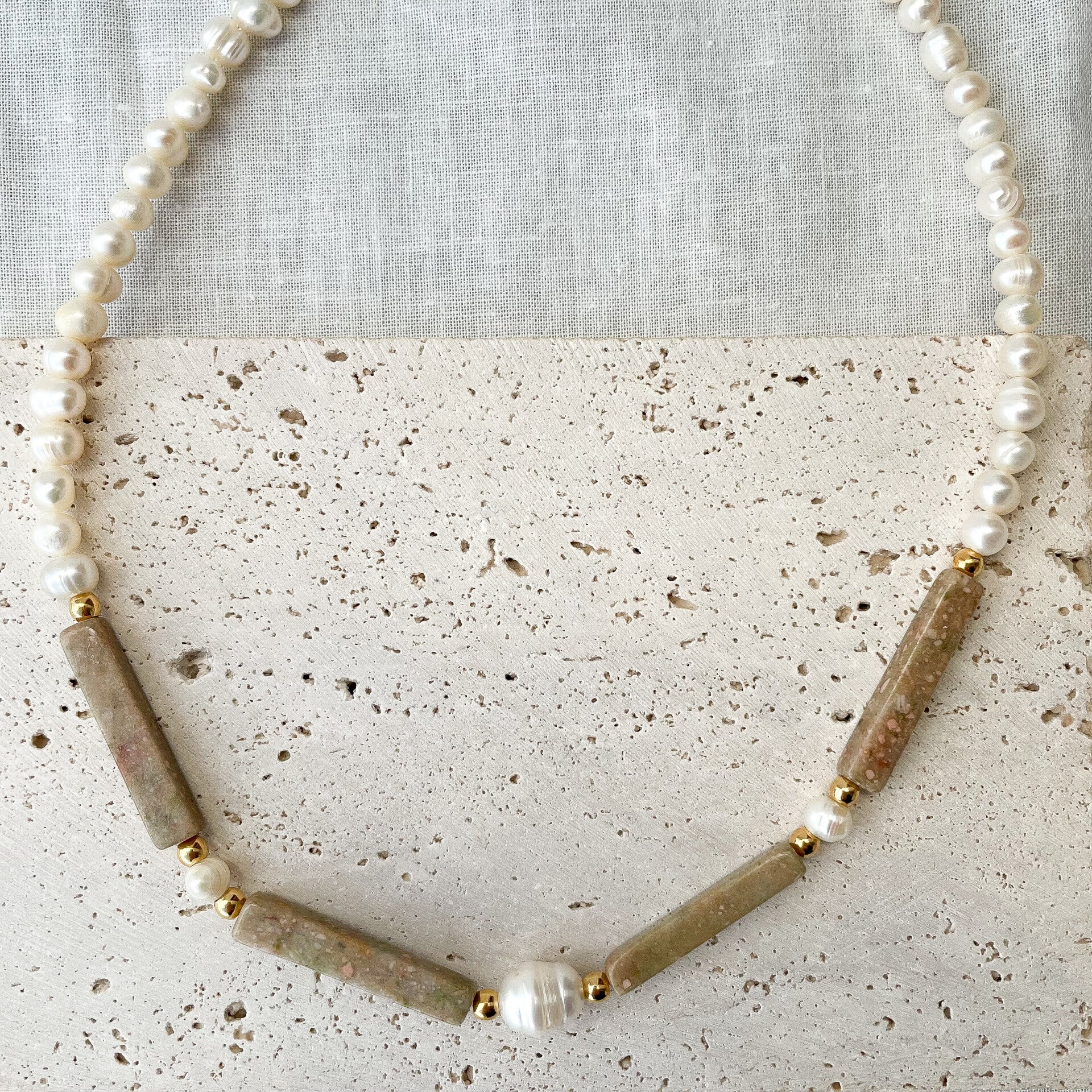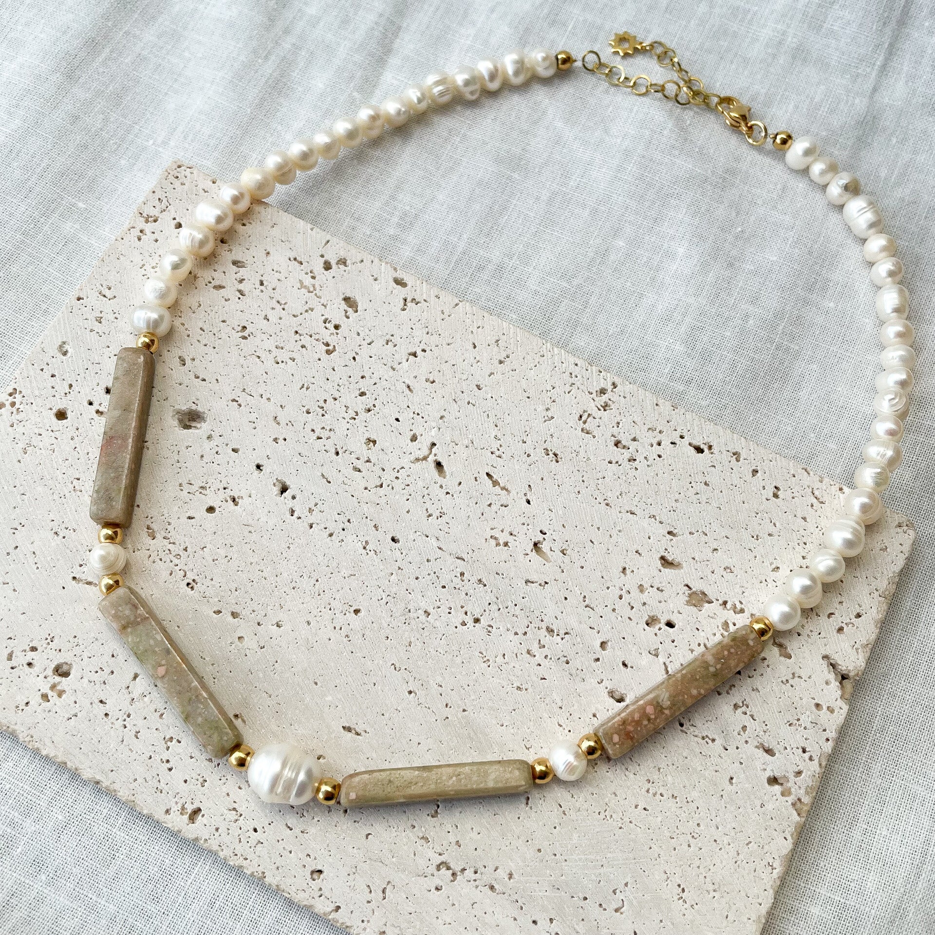 Unique, composé de véritables perles d’eau douce aux formes organiques, sublimées par des pierres naturelles aux tons beige rosé. L’équilibre entre matières brutes et finitions délicates en fait un bijou à la fois moderne et intemporel.
