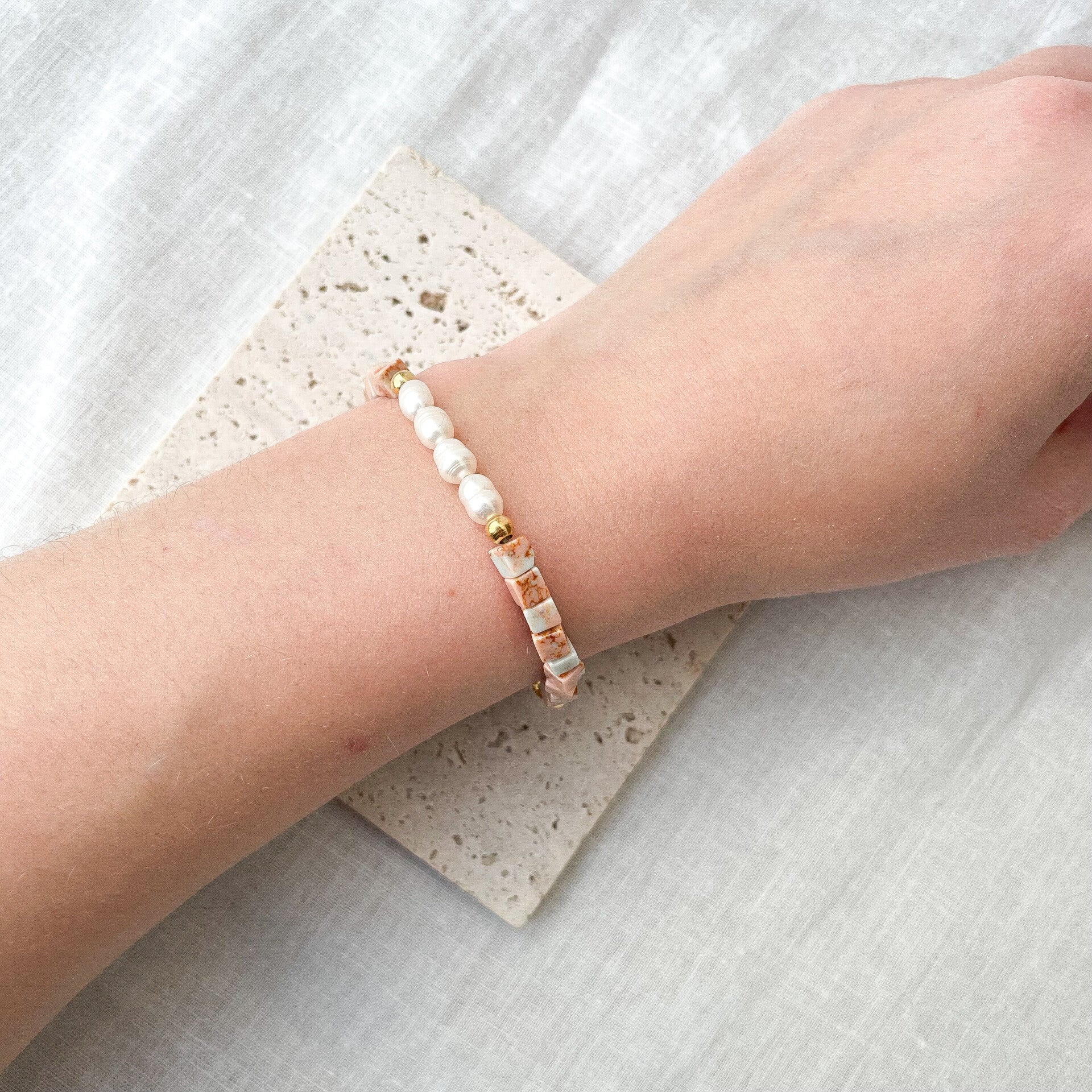 Ce bracelet sublime votre poignet avec un jeu de textures délicat. Il associe l'éclat organique des perles d'eau douce à la structure graphique de petites pierres naturelles taillées en cubes. Ses nuances de beige, de rose poudré et de terracota en font un accessoire lumineux, facile à porter en toute saison.